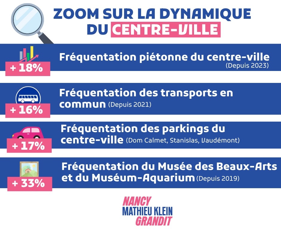 Un soutien actif aux commerçants avec un centre-ville plus accueillant et plus attractif, des transports en commun au rendez-vous, un accompagnement fort au service du maintien du Hall du Livre en coeur de ville, lle projet en cours de la rénovation du Marché central : oui, notre centre-ville a de l’avenir et la fréquentation piétonne, en hausse de 18 % depuis 2023 le souligne.